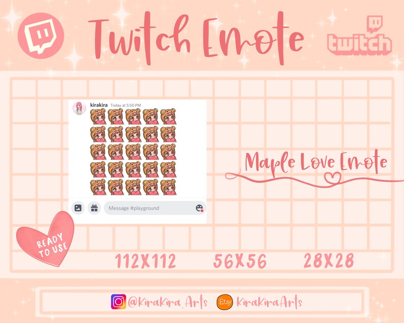 Twitch emotes come in small, medium, and large sizes = 28px by 28px, 56px by 56px, and 112px by 112px.